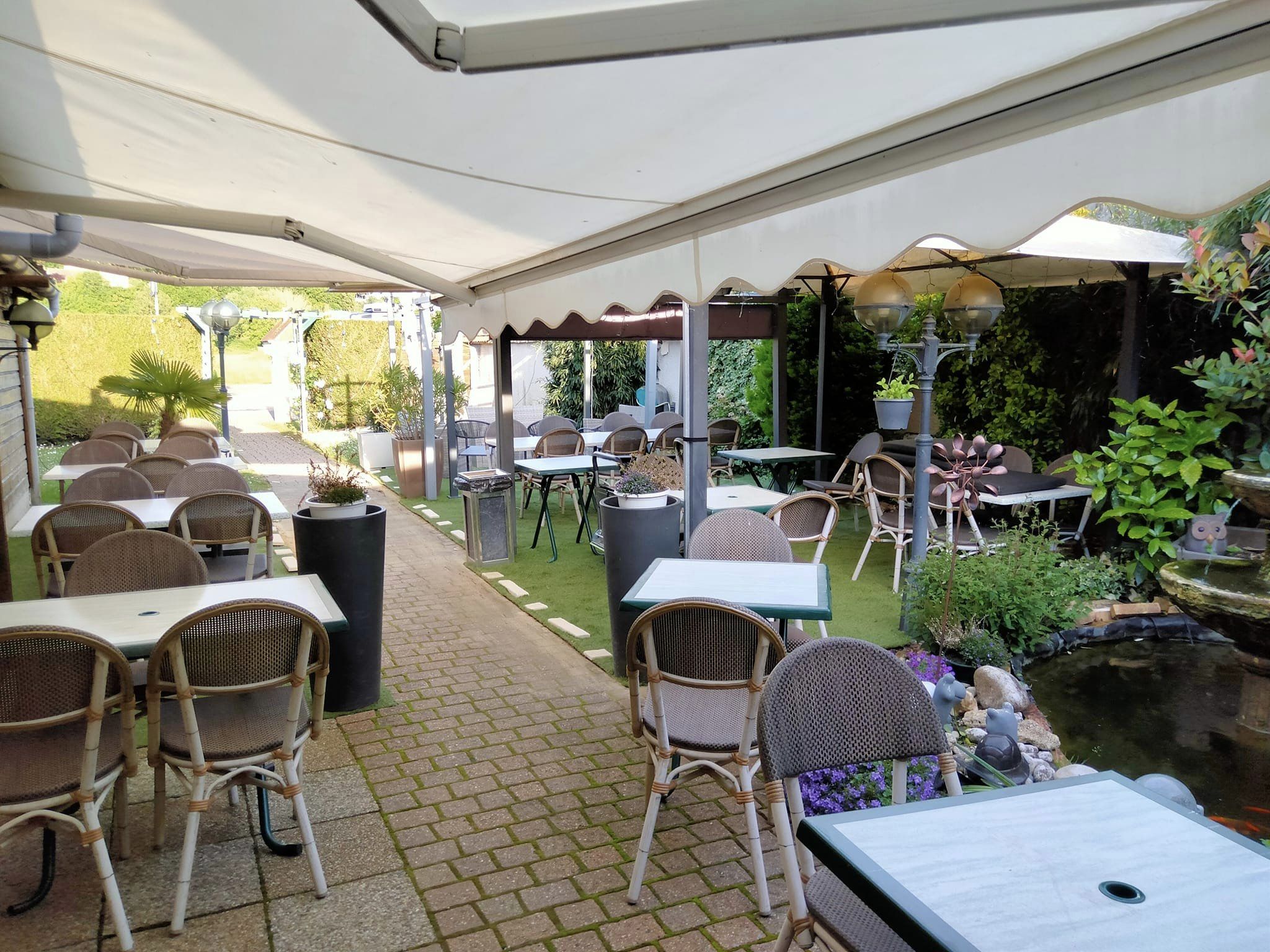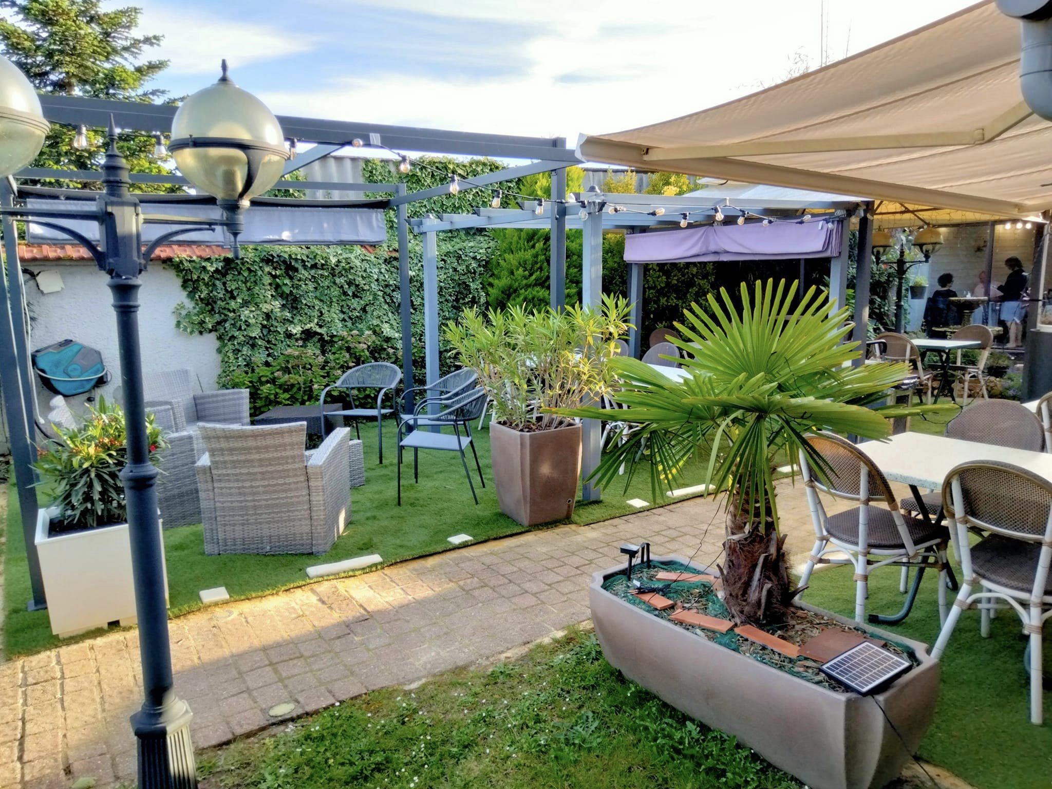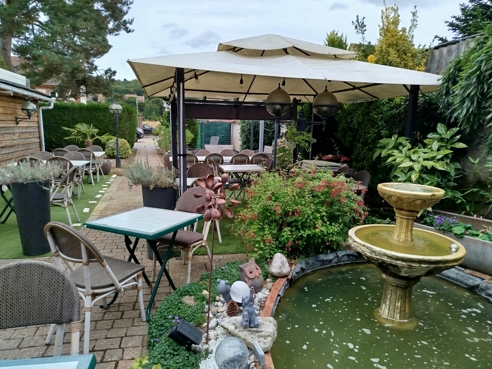 Au cœur du jardin, terrasse d’été, ombragée à souhait, cascade d’eau naturelle.